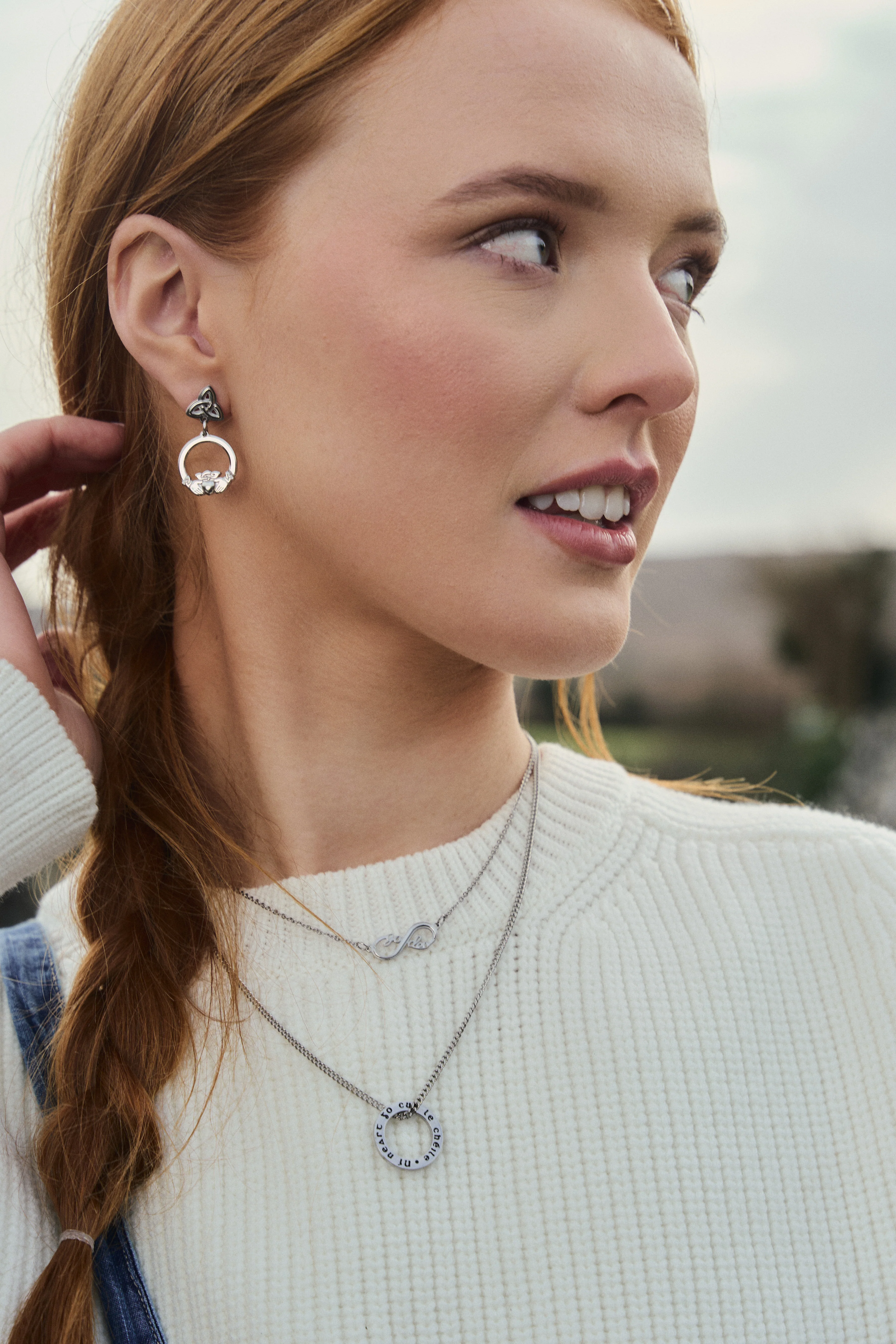 Featuring a Celtic knot stud paired with a circular Claddagh drop, these earrings represent love, loyalty, and friendship, values at the heart of Irish tradition. The flowing knot detail adds depth and movement, creating a statement piece that feels both meaningful and effortlessly wearable.