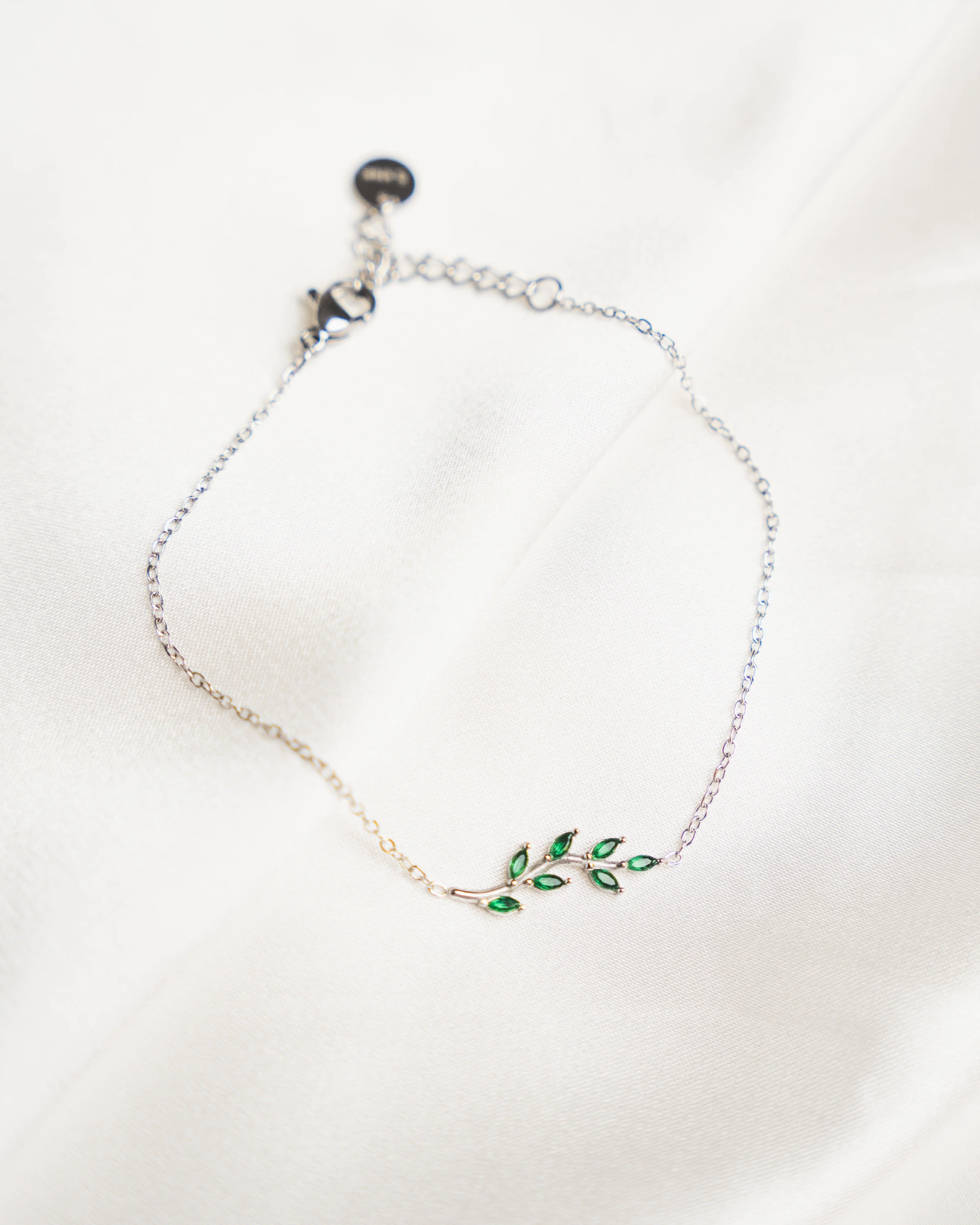 The Irish Emerald Leaf Bracelet features a delicate leaf pendant with vibrant emerald-green gemstones.