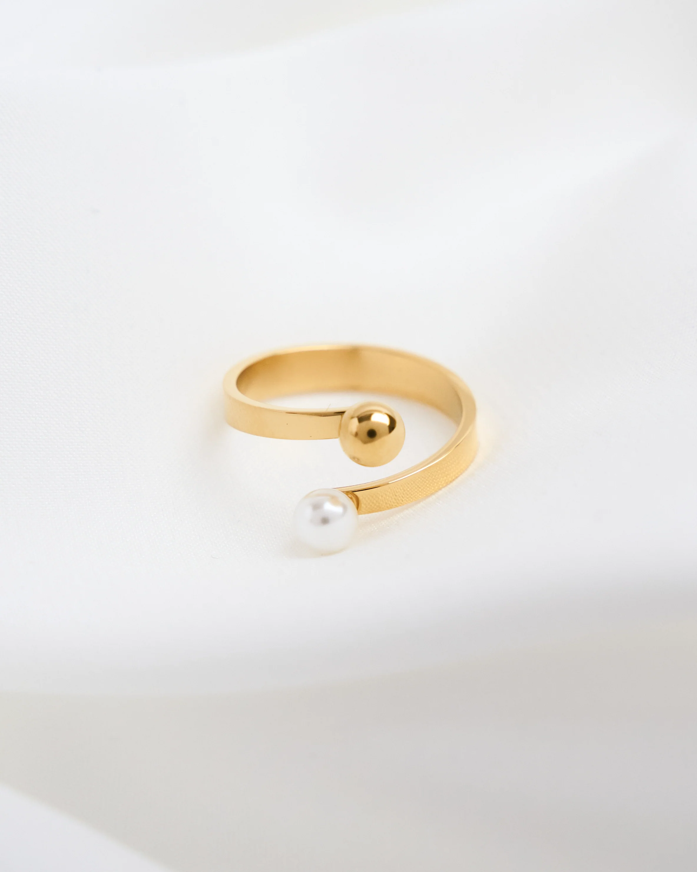 Featuring a delicate pearl paired with a polished sphere, the open design creates a beautifully balanced look that feels both refined and distinctive. The two elements sit gracefully across the finger, offering a subtle statement while maintaining a minimal aesthetic.