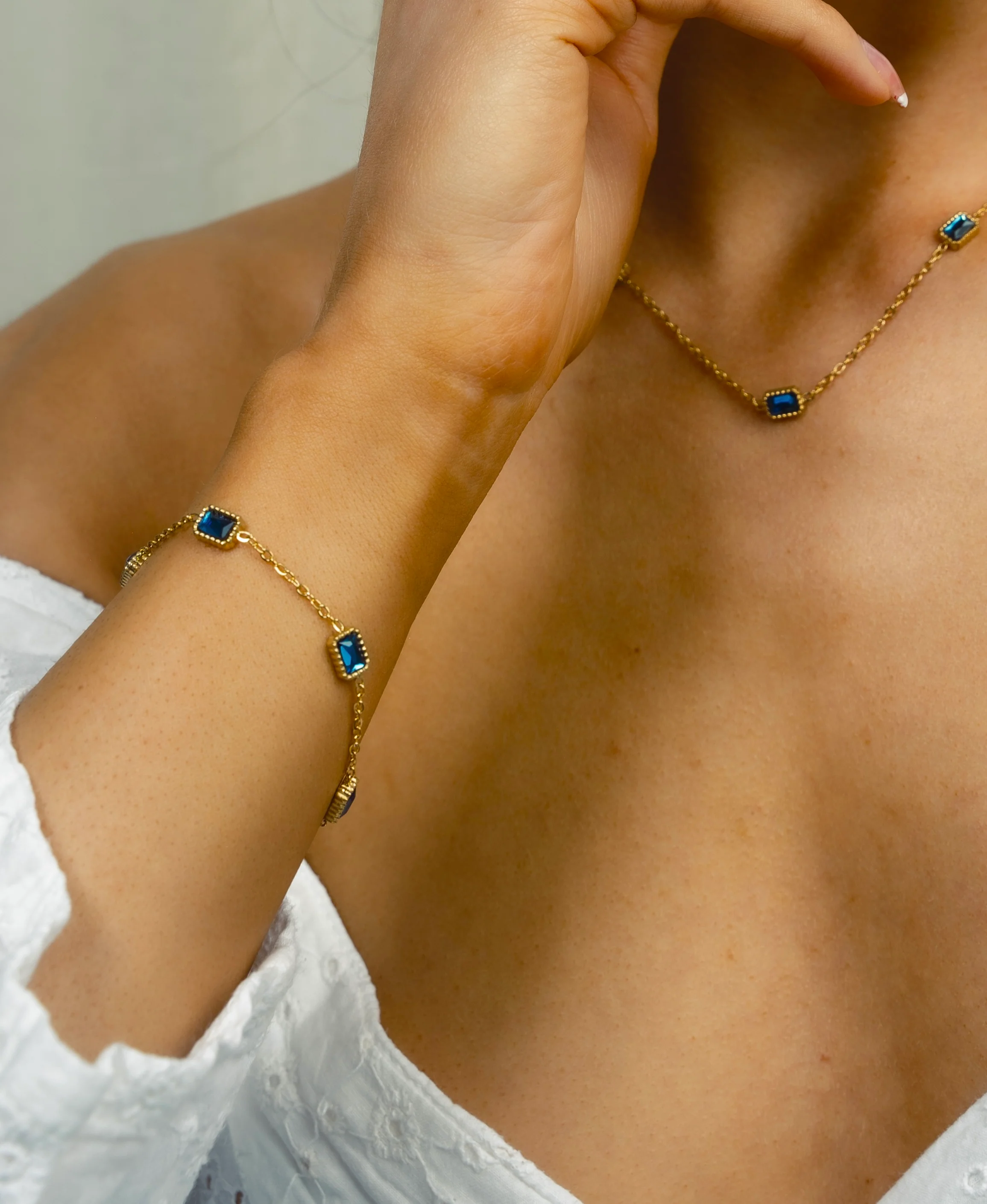 This necklace features a striking blue zircon stone, reminiscent of the Atlantic Ocean's mesmerizing hues.